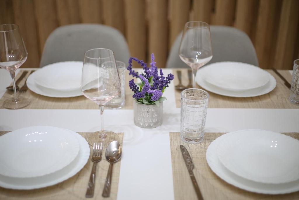 Guests can make meals in the kitchen that comes with a refrigerator, kitchenware, an oven and a toaster.