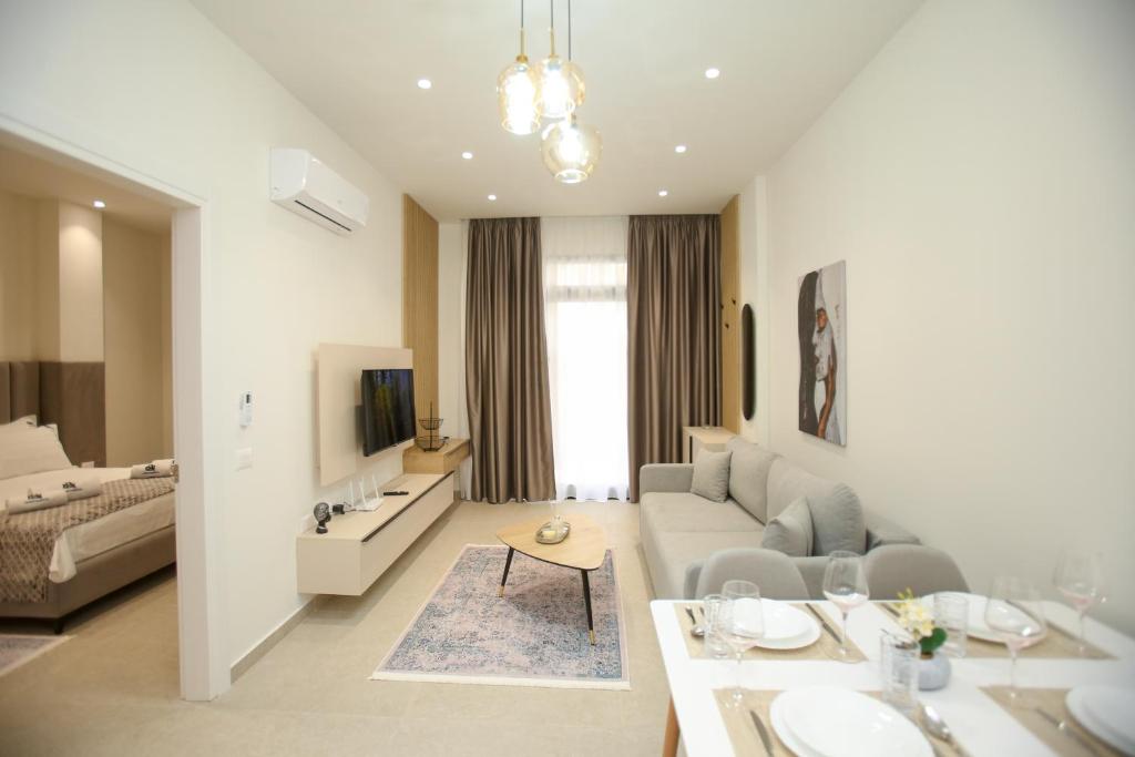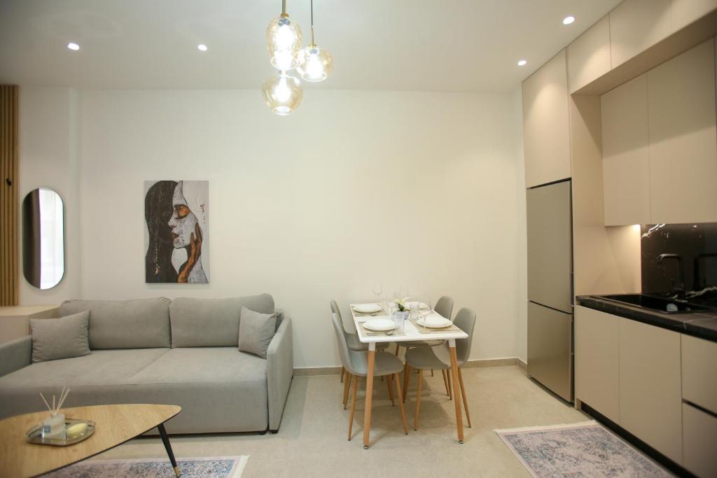 The apartment features a washing machine, a coffee machine, a seating area, a dining area